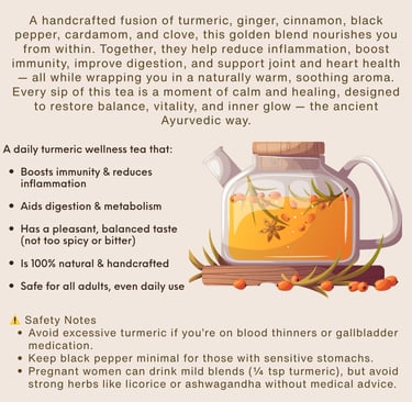 Inspired by the timeless Ayurvedic tradition, our Golden Wellness Tea is a daily ritual for inner balance and natural vitality. Each cup combines the earthy warmth of turmeric and ginger with the aromatic depth of cinnamon and cardamom — an embrace for your body and mind.